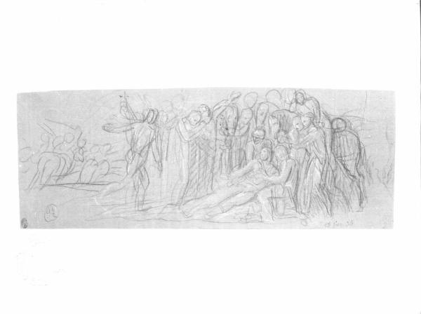- NOTIZIE STORICO CRITICHE Il disegno è uno studio per l'episodio della morte del generale Dasaix durante la Battaglia di Marengo, facente parte dei "Fasti napoleonici" (1803-1807, Sala delle Cariatidi, Palazzo Reale di Milano). Il disegno si riferisce ad una prima fase ideativa del soggetto, poi lievemente modificato nella versione finale. Il segno veloce, sintetico ed efficace nella resa espressiva, è della stessa natura di altri studi a matita del ciclo dei "Fasti". Dal punto di vista iconografico, il tema della morte dell'eroe viene trattato da Appaini guardando ad esempi dell'arte antica e della pittura di arte contemporanea. Il disegno faceva parte della collezione di G. Vallardi che, intono al 1820, ordinò in album ben 344 disegni di Appiani. L'album, di formato atlantico, pervenne all'Accademia di Brera nel 1875 per donazione di E. Cernuschi, allora residente a Parigi, dove lo acquistò nel 1856-1860 (periodo in cui a Parigi si tennero delle aste della collezione Vallardi).