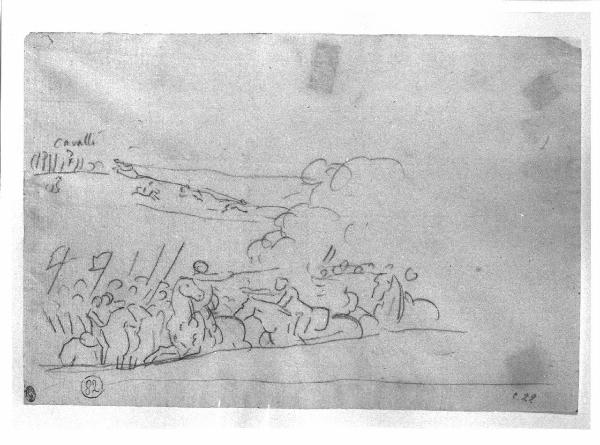 - NOTIZIE STORICO CRITICHE Il disegno fa parte di una serie di studi, velocemente schizzati a matita, relativi agli episodi di Battaglia del ciclo i "Fasti napoleonici" eseguito da Appiani su commissione di Napoleone Bonaparte. Il ciclo era formato da 39 tempere su tela a monocromo, ad imitazione del bassorilievo antico e del chiaroscuro rinascimentale, collocate lungo la ringhiera della Sala delle Cariatidi in Palazzo Reale. Le vicende tormentate della storia materiale di questo ciclo si conclusero nel 1943 con la sua totale distruzione sotto i bombardamenti. Il disegno qui considerato non è relativo ad una battaglia specifica ma uno studio intorno al tema dello scontro fra cavalieri. Il disegno faceva parte della collezione privata di G. Vallardi che, intorno al 1820, ordinò in album ben 344 disegni di Appiani. L'album, di formato atlantico, pervenne all'Accademia di Brera nel 1875 per donazione di E. Cernuschi, allora residente a Parigi dove lo acquistò nel 1856-1860 (periodo in cui a Parigi si tennero aste di vendita di opere di provenienza Vallardi).