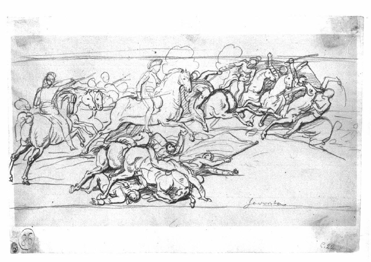 - NOTIZIE STORICO CRITICHE Il disegno fa parte di una serie di studi, velocemente schizzati a matita, relativi agli episodi di Battaglia del ciclo i "Fasti napoleonici" eseguito da Appiani su commissione di Napoleone Bonaparte. Il ciclo era formato da 39 tempere su tela a monocromo, ad imitazione del bassorilievo antico e del chiaroscuro rinascimentale, collocate lungo la ringhiera della Sala delle Cariatidi in Palazzo Reale. Le vicende tormentate della storia materiale di questo ciclo si conclusero nel 1943 con la sua totale distruzione sotto i bombardamenti. Il disegno qui considerato non è relativo ad una battaglia specifica ma uno studio intorno al tema dello scontro fra cavalieri. Il disegno faceva parte della collezione privata di G. Vallardi che, intorno al 1820, ordinò in album ben 344 disegni di Appiani. L'album, di formato atlantico, pervenne all'Accademia di Brera nel 1875 per donazione di E. Cernuschi, allora residente a Parigi dove lo acquistò nel 1856-1860 (periodo in cui a Parigi si tennero aste di vendita di opere di provenienza Vallardi).