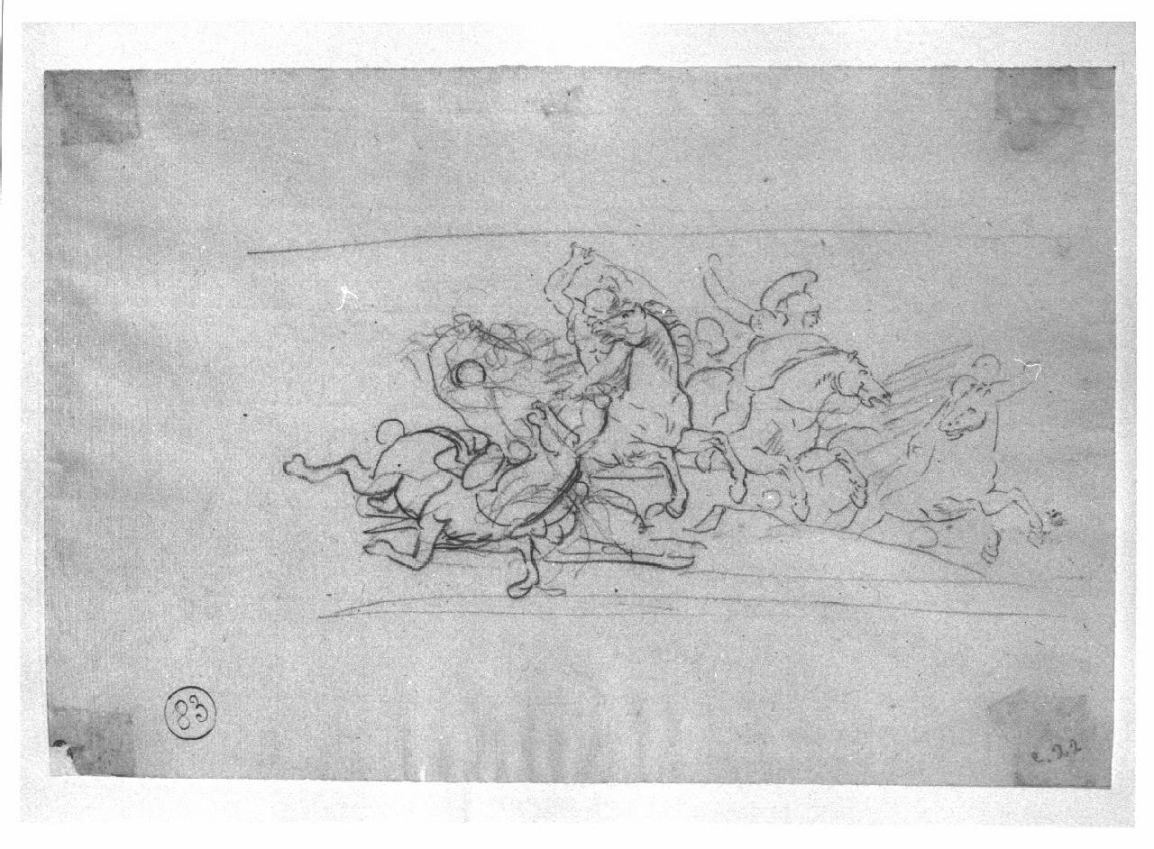 - NOTIZIE STORICO CRITICHE Il disegno fa parte di una serie di studi, velocemente schizzati a matita, relativi agli episodi di Battaglia del ciclo i "Fasti napoleonici" eseguito da Appiani su commissione di Napoleone Bonaparte. Il ciclo era formato da 39 tempere su tela a monocromo, ad imitazione del bassorilievo antico e del chiaroscuro rinascimentale, collocate lungo la ringhiera della Sala delle Cariatidi in Palazzo Reale. Le vicende tormentate della storia materiale di questo ciclo si conclusero nel 1943 con la sua totale distruzione sotto i bombardamenti. Il disegno qui considerato non è relativo ad una battaglia specifica ma uno studio intorno al tema dello scontro fra cavalieri. Il disegno faceva parte della collezione privata di G. Vallardi che, intorno al 1820, ordinò in album ben 344 disegni di Appiani. L'album, di formato atlantico, pervenne all'Accademia di Brera nel 1875 per donazione di E. Cernuschi, allora residente a Parigi dove lo acquistò nel 1856-1860 (periodo in cui a Parigi si tennero aste di vendita di opere di provenienza Vallardi).