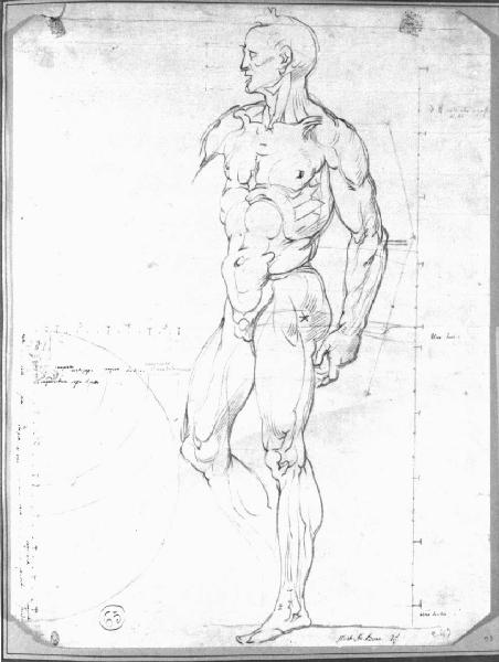 - NOTIZIE STORICO CRITICHE Il disegno rappresenta uno studio del corpo umano. Dall'indicazione della scritta in basso, potrebbe trattarsi di una copia da Michelangelo. Nel complesso del corpus grafico di Appiani, questo rappresenta un "unicum": lo stile è piuttosto rigido e non permette una sicura attribuzione all'artista, anche nel caso si trattasse di uno studio risalente al periodo formativo. Il disegno faceva parte della collezione privata di Giuseppe Vallardi che, intorno al 1820 ordinò in album ben 344 disegni di Appiani. L'album, di formato atlantico, pervenne all'Accademia di Brera nel 1875 per donazione di E. Cernuschi, allora residenta a Parigi, dove lo acquistò nel 1856-1860 (periodo in cui a Parigi si tennero aste di vendita di opere di provenienza Vallardi).