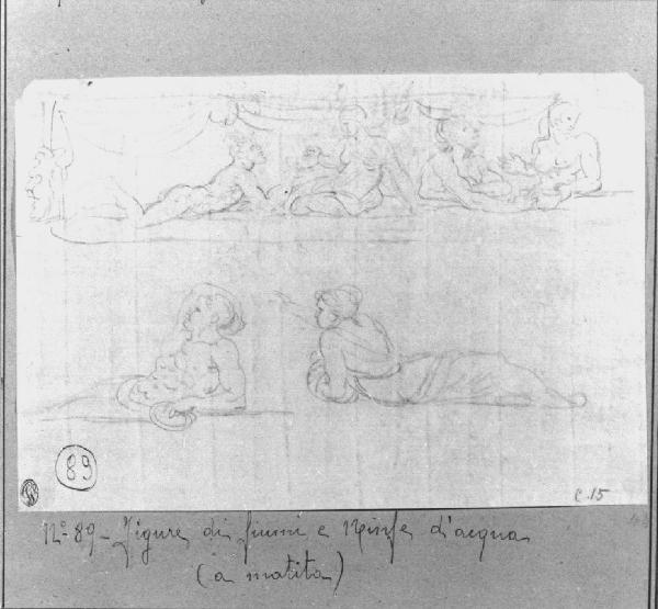 - NOTIZIE STORICO CRITICHE Il disegno presenta uno studio di soggetto mitologico, con figure di Ninfe d'acqua e di fiumi. Il fregio, nella parte superiore, fa pensare alla eleborazione di motivi classici ad uso ornamentale-decorativo, come confermerebbe la presenza di maschere e di tendaggi, un intervento in ambito decorativo-scenografico che si allinea con l'attività di Appiani in campi "minori" della 'produzione artistica.
