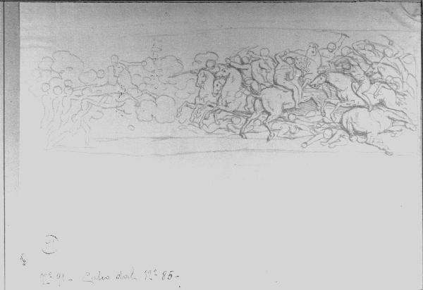 - NOTIZIE STORICO CRITICHE Il disegno presenta uno studio di combattimento tra Fanti e Cavalieri ed è un calco del disegno n° 85. Esso fa parte di una serie di calchi da disegni di battaglie conservati nell'album Vallardi. Quello degli studi di battaglia è l'unico esempio di calco presente nel corpus grafico di Appiani e ciò fa ritenere che lo stesso autore abbia eseguito il ricalco per poter studiare e verificare la composizione, dal punto di vista della dinamica espressiva.