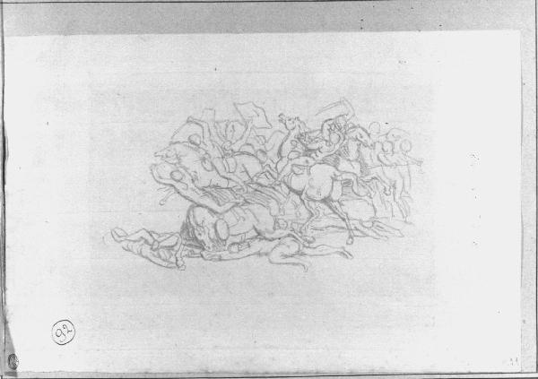- NOTIZIE STORICO CRITICHE Il disegno presenta uno studio di combattimento tra Fanti e Cavalieri ed è un calco del disegno n° 87. Esso fa parte di una serie di calchi da disegni di battaglie conservati nell'album Vallardi. Quello degli studi di battaglia è l'unico esempio di calco presente nel corpus grafico di Appiani e ciò fa ritenere che lo stesso autore abbia eseguito il ricalco per poter studiare e verificare la composizione, dal punto di vista della dinamica espressiva.