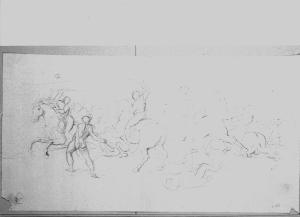 - NOTIZIE STORICO CRITICHE Il disegno presenta lo studio di combattimento tra Fanti e Cavalieri e fa parte di una serie di studi per gli episodi di battaglia del ciclo dei "Fasti napoleonici". Il foglio si riferisce alla "Battaglia di Montenotte" con qualche variante rispetto alla soluzione finale. Per l'eleborazione di questo tema, Appiani guarda ai modelli dell'antichità classica (bassorilievi), agli esempi rinascimentali e alla coeva pittura di storia contemporanea, soprattutto francese.