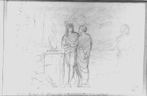 - NOTIZIE STORICO CRITICHE Il disegno presenta lo studio per una rappresentazione di rito nuziale, svolto secondo i canoni dell'estetica neoclassica attraverso una raffigurazione allegorica. Il rito si svolge all'uso antico, presso un'ara a cui si accostano i due sposi paludati. Un genio alato li incorona. Un altro genio alato (la Storia?) iscrive l'evento sull'ara, a perenne memoria. Si tratta di uno studio per opera su commissione privata, di cui non si hanno dati. Esiste un disegno molto più accurato (ubicazione ignota) dello stesso soggetto indicato come composizione allegorica per le nozze di Beatrice Cusani e G.B. Litta Modignani.\n\nAl verso studio delle due figure centrali della composizione sul recto, studio di mani giunte.