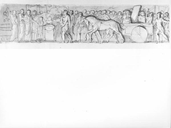 - NOTIZIE STORICO CRITICHE Il disegno è uno studio preparatorio di corteo trionfale, con scena di sacrificio, e fa parte di una serie di studi, per lo più acquerellati e alcuni quadrettati, raltivi ad un fregio di cui non si conosce l'opera di riferimento. Il tema e la soluzione compositiva adottata guardano direttamente ai bassorilievi antichi con episodi di trionfo e sacrificio di età romana. Lo stile, particolarmente maturo nell'efficace resa espressiva e dinamica, collocherebbe questi studi intorno al 1805-1810. In mancanza di fonti certe, questa serie di studi rimane problematica anche dal punto di vista attributivo.