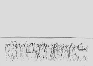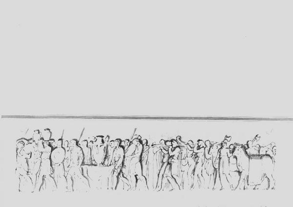 - NOTIZIE STORICO CRITICHE Il disegno è uno studio preparatorio di corteo trionfale, e fa parte di una serie di studi, per lo più acquerellati e alcuni quadrettati, raltivi ad un fregio di cui non si conosce l'opera di riferimento. Il tema e la soluzione compositiva adottata guardano direttamente ai bassorilievi antichi con episodi di trionfo e sacrificio di età romana. Lo stile, particolarmente maturo nell'efficace resa espressiva e dinamica, collocherebbe questi studi intorno al 1805-1810. In mancanza di fonti certe, questa serie di studi rimane problematica anche dal punto di vista attributivo.