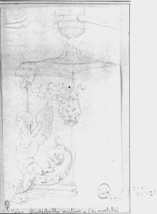 - NOTIZIE STORICO CRITICHE Il disegno presenta uno studio per la base di quella che sembrerebbe una candelabra. Appiani ricorre a motivi tipici del repertorio decorativo neoclassico come la Sfinge alata, il delfino, teste leonine e arieti, festoni, ecc., diffusi ampiamente tramite stampa. Lo stile e il gusto raffinato collocano questo disegno entro il primo decennio del XIX secolo.