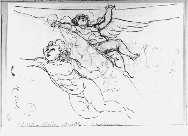 - NOTIZIE STORICO CRITICHE Il disegno presenta due studi per gli angeli, affrescati da Appiani nei pennacchi, con gli Evangelisti, della cupola di Santa Maria presso San Celso.