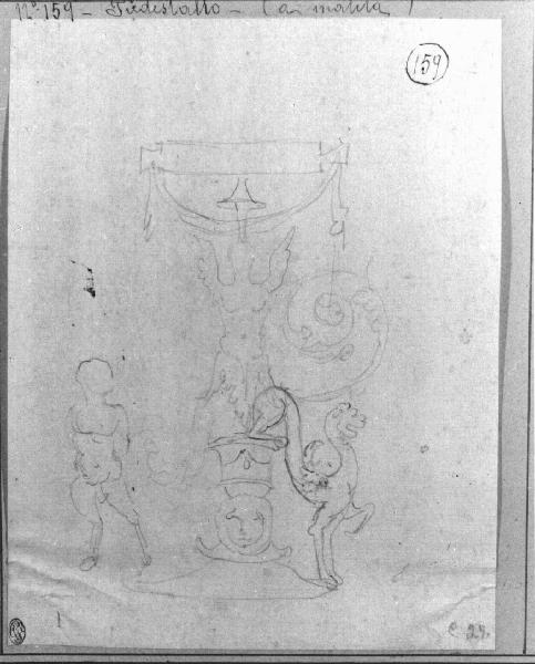 - NOTIZIE STORICO CRITICHE Il disegno presenta uno studio per la base di un'insegna. Appiani fa ricorso al consueto repertorio decorativo neoclassico (grifi, sfingi, volute con foglie d'acanto,ecc.) ampiamente diffuso attraverso la stampa. Lo stile e il gusto raffinato collocano questo disegno entro il primo decennio del XIX secolo.