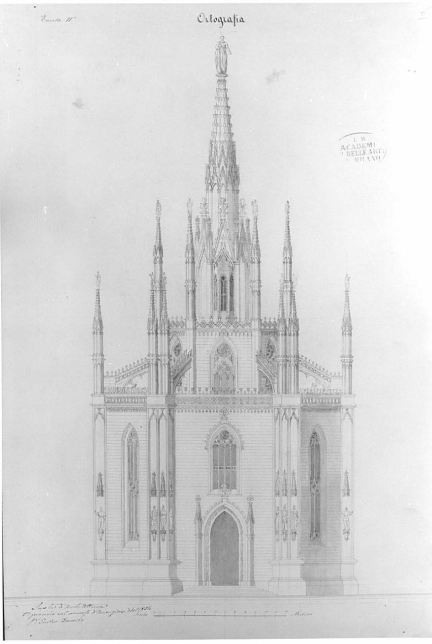 Prospettoo di edificio in stile gotico a china con ombreggiature più scure. Edificio simmetrico, con facciata a salienti e guglie in corrispondenza dei contrafforti. Al centro guglia sormontata da statua. Al p. t. portale ad arco acuto preceduto da scalini, sup. finestra ad arco gotico con vetrata, lat. contrafforte ornato da statue, a ds. e a sn., muratura obliqua con finestra ad arco gotico.