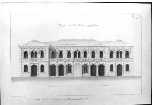 Prospetto di edificio in stile neogotico, a china e bistro con ombreggiature più scure, tetto e portale centrale in acquerello azzurro. Terreno sfumato in acquerello marrone, sfondo sfumato in azzurro. Edificio simn.a 2 p., parte centrale leggermente arretrata ed ali aggettanti. Al pt. al centro 6 arcate sormontate da terrazza balaustrata; lat. arcate d'ingresso.Finestrelle ad arco. Muratura a fasce al pt.; sup. sequenza di finestre polilobate; in corrispondenza degli archi d'ingresso, bifore polilobate. Cornice a merli e tetto a padiglione.