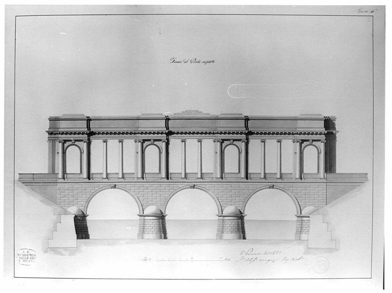 Fianco di ponte coperto a china e bistro con ombreggiature più scure, terreno sezionato campito in acquarello ocra,sezione argini campite in rosa, acque in acquarello azzurro. Ponte poggiante su 3 arcate sostenute da piloni semisommersi in pietra a vista. Carreggiata delimitata da parapetto e da coppie di colonne ioniche alternate ad arcate entro colonne ioniche. Le arcate sono poste in corrispondenza dei piloni d' appoggio. Sup. cornice continua a mensole, piano attico, copertura a gradoni in corrispondenza delle arcate e della parte centrale.