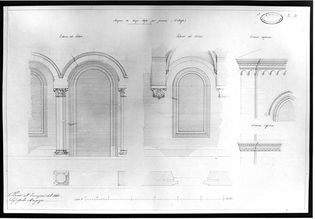 Dettagli di finestre a china e matita, con parti eseguite a tratteggio e murature sezionate campi te a tratteggio a 45°. In alto a sin.: prospetto parziale di porticoo (1 arcata e mezza) con archi a tutto sesto sorretti da pilastri con capitello ornato da motivi fitomorfi; al centro finestra ad arco; a ds. particolare della oornice sottogronda ad archetti ciechi pensili. In basso a sin. pianta del portico (sez. dei pilastri) e a ds. pianta del serramento.