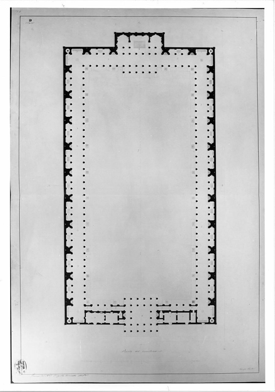 Pianta di edificio rettangolare con murature campite a china e proiezione dei soffitti in inchiostro rosso, con corpi aggettanti posti al centro dei lati minori del rettangolo. Sul lato minore inferiormente: pronao esastilo preceduto da scalini. Lungo i lati maggiori serie di cappelle rettangolari. All'interno vasta corte delimitata da colonne e preceduta da scalini campita in acquarello beige.