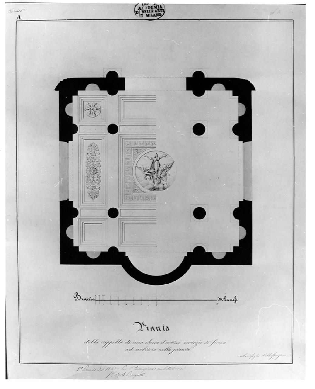 Pianta di cappella con murature campite a china con nicchie e finestre campite a bistro. Vista parziale (metà sinistra) della proiezione del soffitto. Cappella quadrata con abside semicircolare sul lato inf. e ingresso sul lato sup. Apertura al centro degli altri 2 lati. Al centro 4 colonne. Decorazione del soffitto a cassettoni, al centro tondo dipinto.