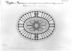Progetto per un mercato del pesce e della selvaggina: pianta dei sotterranei. Pianta di edificio ad anello ellittico con vasca circolare posta al centro della corte interna e 8 vasche intorno, a china bistro e acquarello azzurro e beige. Schema dei canali delle acque in acquarello azzurro: un canale scorre lungo il perimetro esterno dell'ellisse; 4 canali attraversano l'anello (lungo gli assi minori e maggiori) dove sono posti vani scale. Un altro canale scorre lungo il perimetro interno dell'anello intorno alle vasche. Dal canalebdipartono 8 derivazioni alle 8 vasche. All'interno dell'edificio scorre un canale ellittico che si raccorda al canale esterno attraverso canaline.