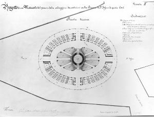 Progetto per un mercato del pesce e della selvaggina: planimetria del pian terreno. Pianta di edificio ad anello ellittico con vasca circolare posta al centro della corte interna e 8 vasche intorno, a china bistro e acquarello azzurro grigio chiaro e grigio scuro. Intorno all'edificio sono rappresentate le sagome degli isolati. Sono indicati i nomi delle vie e delle piazze. L'edificio è circondato da un percorso ellittico cintato da una cancellata. Gli ingressi sono posti sugli assi minore e maggiore (in corrispondenza del perimetro esterno). All'interno dell'anello vi sono piccoli vani con vasche rettangolari e scale. Al centro della corte vasca circolare posta su un basamento, accessibile mediante scale.