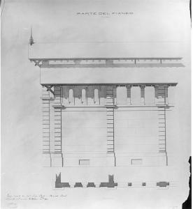 Progetto per un mercato coperto a Milano. Realizzato su carta pesante. Particolare di prospetto raffigurante due campate murarie allineate allo stralcio planimetrico sottostante. Muratura in conci di pietra scandita da lesene bugnate raccordate da cornice. Fascia superiore finestrata costituita da tre monofore arcuate (a sinistra) e trabeate (a destra). Copertura a falda sfalsata con zona di areazione intermedia.