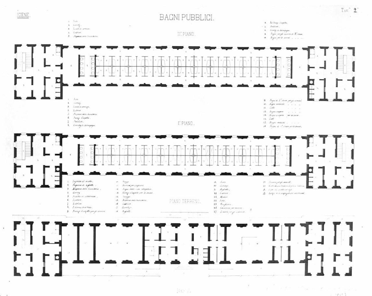 Piante del p.t. (inf.) del 1° (centro) e del 2° piano (sup.) di edificio rettangolare con ali sporgenti. Murature campite in china. All'interno dei vani numeri di riferimento alle legende poste a edstra e a sinistra, sopra le piante. Al p.t.: scale d'accesso al corpo centrale, lateralmente ballatoi esterni per accedere agli altri vani. Al 1° e al 2° posto nel corpo centrale, i locali dei bagni con le vasche e nelle ali i vani scala.