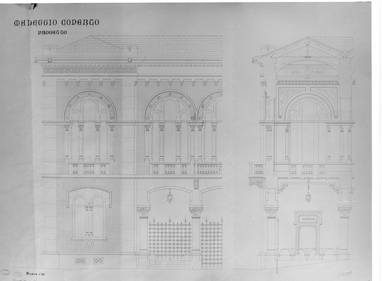 Particolari di edificio di architettura neomedievale a china con murature sezionate campi te in acquarello rosa. A sn. particolare di facciata in mattoni con paraste e basamento a bugnato. Edificio a 2pp. con tetto a falde: al pt. basamento a bugnato con 2 aperture rettangolari, sup.Bifora ad arco sormontata da cornice ad arco ribassato con 2 colonne al centro, davanzale con cornice a dentelli e stemma decorativo centrale; vista di parte di portico ad arcate ribassato con cancellata in ferro; al 1° piano trifora con aperture ad arco centrale più alto, inscritte entro cornice ad arco. A ds. sezione con vista del vestibolo al pt. ambiente con soffitto a cassettoni e porta centrale rettangolare. Superiormente vista dall'interno di una trifora con balaustra. Copertura a volta ribassata. Disegno della struttura del tetto.