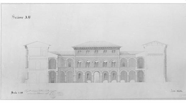 Sezione trasversale di edificio a china con ombreggiature a tratteggio. Prospetti interni su corte con corpo centrale a 3 pp. e corpi lat. a 2 pp. : al p.t. porticato con 5 arcate nel corpo centrale e 2 ali corpi laterali. Al 2° piano 5 bifore rett. Sup. cornicione con mensole e tetto a padiglione. Nei corpi lat. cornice ad archetti ciechi pensili e tetto a padiglione. A destra e a sinistra sezione del portico edella loggia sup. con disegno della struttura del tetto. A ds. ballatoio con balaustra polilobata sostenuta da mensole.