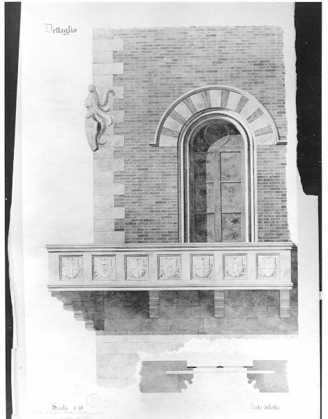 Particolare di facciata di edificio con finestra con balcone in dettaglio, a china e acquerello rosso per le parti in mattoni e ocra per le altre, marrone per ombreggiatura, marrone "terrabruciata" per le parti in legno dell'infisso e grigioazzurro sfumato per i vetri. Finestra ad arco con cornice a fasce sormontata da ghiera con conci alternati in pietra e mattoni. Infisso ad arco a 2 ante tripartite con lunetta sup. nella quale è inscritto cerchio. Balcone sostenuto da mensole con parapetto ornato da riquadri con stemmi e bassorilievo. Sullo spigolo in pietra della facciata, stemma sporgente. Sotto il prospetto sez orizzontale con murature.