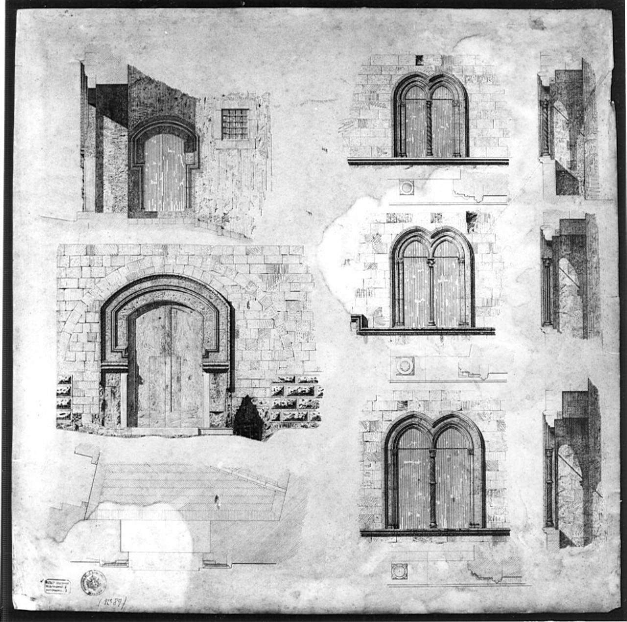 Rilievo di Palazzo Vitelleschi: particolari di finestre e porto (piante, prospetti, sezioni). Serie di tre finestre Ie due porte sovrapposte, a china nera, con ombreggiature. Dal b. ds: pianta, prospetto e sezione di bifora a sesto acuto con doppia cornice modanata e colonnina composta da 2 fusti tortili di opposta torsione con capitello fitomorfo. In a. bifora a sesto acuto con tripla cornice semplice, colonna tortile I decorata e capitello fitomorfo. A sn dal b. piante e prospetto di porta a sesto ribassato con cornice doppia cornice. Rilievo delle venature del legno di battente di porta più piccola. Pianta del sistema d'ingresso composto da 2 porte (prospetti sup.) e una parte di audito intermedio. In a. prospetto di piccola porta con cornice col orecchie e sezione della porta sottostante.