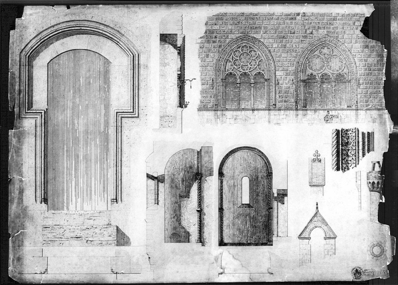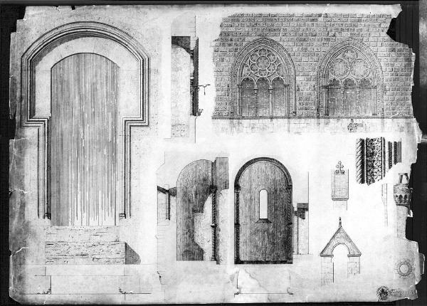 Disegno a china nera su due fogli di carta incollati. che raffigura il rilievo di Palazzo Vitelleschi con una serie di particolari architettonici di edificio a china nera, con ombreggiature. Dal bordo destro: prospetto sezione e pianta di comignolo con archetti su mensola; prospetto di fianco di campanile a vela e superiormente particolare della croce: pietra. In basso al centro: sezioni (longitudinale e trasversale e pianta di nicchia con monofora affiancata all'entrata, da due doppie colonne tortili incassate, in parte, nella muratura. Tali colonne sono caratterizzate dalla sovrapposizione opposta a quella superiore. Capitello fitomorfo. A sinistra: prospetto e pianta di porta a sesto ribassato con cornice ad orecchie. In alto al c. sezione e prospetto di 2 trifore racchiuse in arco a sesto acuto, con cornice lavorata, comprendenti due diversi sistemi di rosoni. Inferiormente: dettaglio della cornice.