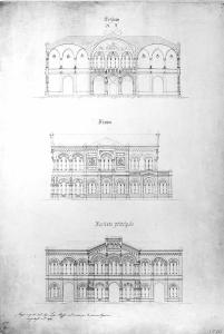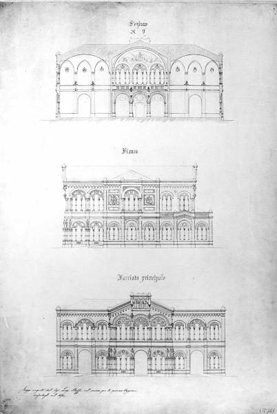 Progetto di palazzo (due prospetti e una sezione), a a china color seppia su carta pesante. In basso pianta del piano terra, rettangolare con avancorpo centrale. E' indicata la destinazione d'uso. Un locale centrale da accesso all'edificio affiancato da due sale quadrate con relativi accessi secondari e rampe. Segue un corridoio che percorre tutta la larghezza dell' edificio coperto, con volte a crocIera che contiene all'estremità i servizi e, al c. serve un ingresso alle scale (ds) ed una saletta (sn). Proseguendo sull'asse centrale si giunge ad un ampio terrazzo da dove si accede a destra e a sinistra a due locali rettangolari In alto la facciata a due piani in stile neogotico. Al centro il corpo aggettante: accesso a due trifore laterali polilobate; ai lati colonne binate addossate ai pilastri, con statue. 1°piano: tre trifore e, sopra alla centrale, un'edicola con tre nicchie con\nfigure all'interno che interrompe il cornicione a saliente. Corpi laterali: accesso affiancato da due bifore; al piano superiore: trifora affiancata da due bifore.