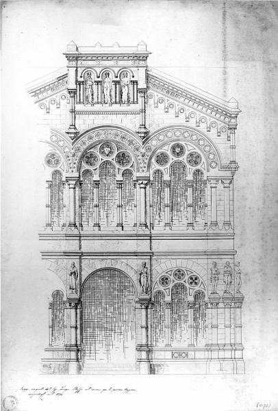 Progetto di palazzo (particolare della facciata), a china color seppia su carta. Particolare, in parte ombreggiato del prospetto di palazzo (campata centrale, destra e parte della sinistra). P.t.: accesso con 3 gradini che porta ad un loggiato con arco a tutto sesto e trifora con arco a tutto sesto con tondi quadrilobati. Ai lati dell'ingresso ed all'angolo del corpo di fabbrica, colonne addossate ai pilastri che sorreggono statue d'artisti. Al piano superiore tre trifore sono circondate da tondi polilobati in corrispondenza alla trifora centrale si eleva, retta da 4 colonne binate, un'edicola con tre nicchie con le tre muse ispiratrici (architettura, scultura, pittura). La copertura inclinata caratterizza anche il cornicione a saliente composto da archetti pensili e modanature.
