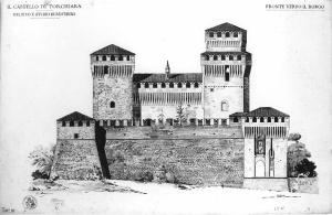 - NOTIZIE STORICO CRITICHE Il disegno fa parte di una serie di tavole (11 ) raccolte in 1 cartella dal titolo: "Saggio FINALE DELLA PENSIONE OGGIONI/: CASTELLO DI TORCHIARA/ RILIEVO E STUDIO DI RESTAURO" (firmato dall'autore; Timbri dell'Accademia). E' stato eseguito per il saggio finale della Pensione Oggioni (1891-94) nel 1893, e consegnato alla Commissione nel 1894. (Atti...,1891,p.153). Nel 1891 ottiene, oltre alla pensione, anche il diploma di Professore di disegno architettonico.