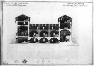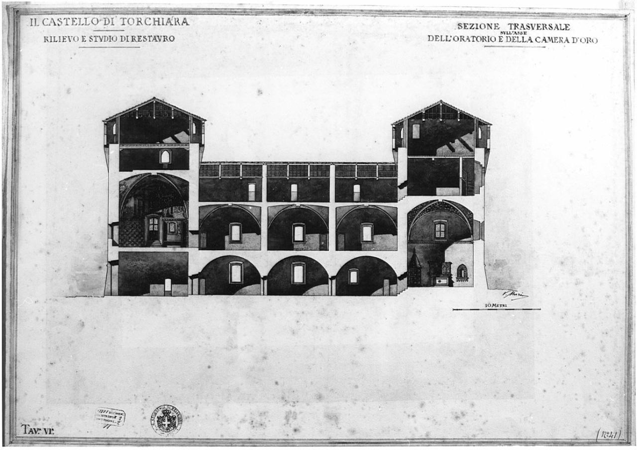 - NOTIZIE STORICO CRITICHE Il disegno fa parte di una serie di tavole (11 ) raccolte in 1 cartella dal titolo: "Saggio FINALE DELLA PENSIONE OGGIONI/: CASTELLO DI TORCHIARA/ RILIEVO E STUDIO DI RESTAURO" (firmato dall'autore; Timbri dell'Accademia). E' stato eseguito per il saggio finale della Pensione Oggioni (1891-94) nel 1893, e consegnato alla Commissione nel 1894. (Atti...,1891,p.153). Nel 1891 ottiene, oltre alla pensione, anche il diploma di Professore di disegno architettonico.