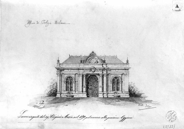 Sul recto: progetto di Ufficio di Polizia Urbana su carta pesante. Prospetto a matita di edificio in stile negotico ad 1 piano. Facciata simmetrica con portone ad arco centrale entro colonne, sormontato da semiarco con orologio. Lateralmente finestre bifore entro arco a tutto sesto. Tetto a falde.