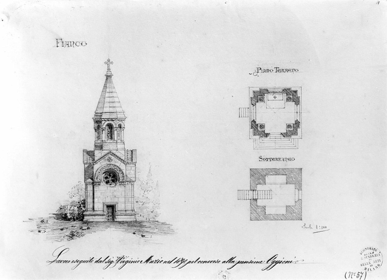 Sul recto: progetto di Cappella funeraria. A destra prospetto di Cappella in stile neogotico, con porta rettangolare d'accesso e rosone. Torretta poligonale con tette a spioventi. A sinistra piante a forma quadrata con murature a tratteggio.