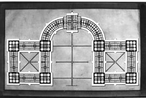 - NOTIZIE STORICO CRITICHE Il disegno fa parte di una serie di sette tavole conservate nella cartella 12 che raccoglie numerosi saggi di concorso rifiutati dalla Commissione esaminatrice. Il progetto è relativo al concorso di prima classe per l'architettura dell'anno ed era destinato ad essere restituito al concorrente. Le tavole, anonime, sono comunque fornite di un motto che le contraddistingue come era d'uso procedere nelle prove di concorso accademico di prima classe. Nella stessa cartella sono conservate anche prove di accesso al pensionato romano e progetti di Zanoja.\nConcorso di prima classe, anno 1808?