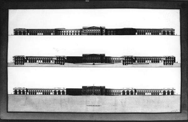 Serie: di tre alzati del mercato coperto a china, bistro e acquerello marrone chiaro e rosa: su fondo marrone chiaro sfumato dal basso verso l'alto entro doppia linea di margine a china e bordo azzurro riportato. Inf.: prospetto dell' edificio con vista delle facciate dei due corpi di fabbrica. Quadrangolari e della fontana centrale. Centro: prospetto del corpo semicircolare visto dal cortile.\nSup.: prospetto posteriore.