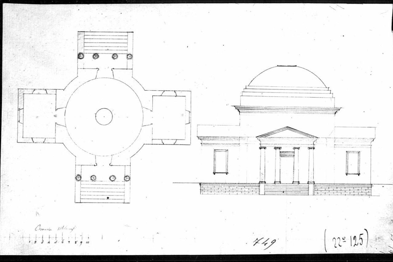 Pianta e alzato a china e matita su fondo chiaro.\nSinistra: pianta di edificiocio are con quattro avancorpi simmetrici di cui due pronai preceduti da gradinate. \nDs.: alzato di edificio con pronao centrale fornito di quattro colonne lisce con capitello ionico. Vista dei corpi di fabbrica laterale e della copertura a cupola con gradoni.