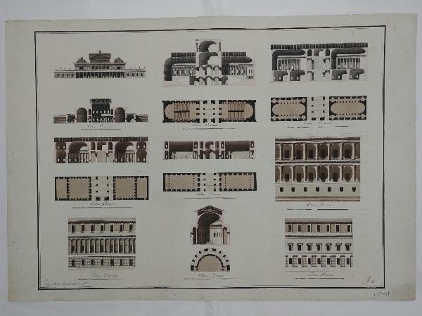 - NOTIZIE STORICO CRITICHE Il disegno fa parte di una serie di tre tavole (probabilmente quattro in origine) conservate nella cartella 12 che raccoglie numerosi saggi di concorso rifiutati dalla commissione esaminatrice o il progetto è relativo al concorso di prima classe per l'architettura dell'anno 1808 ed era destinato ad essere restituito al concorrente. Le tavole, anonime, sono comunque fornite di un motto che le contraddistingue come era diffuso procedere nelle prove di concorso accademico di prima classe. Nella stessa cartella sono conservate anche prove di accesso alla pensione romana, progetti di Zanoja ed altri architetti.