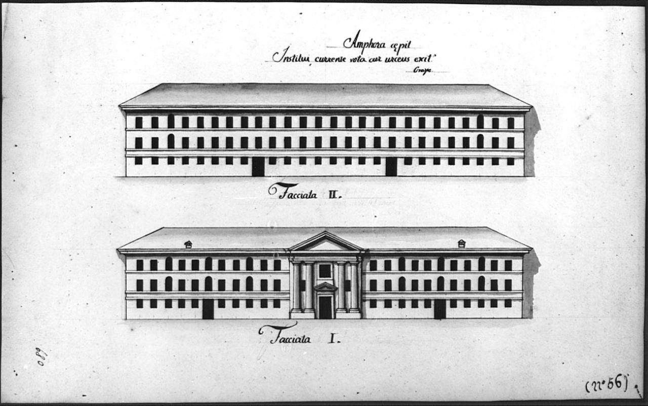- NOTIZIE STORICO CRITICHE La tavola fa parte di una serie di quattro disegni relativi ad un progetto per un edificio (cavallerizza?) redatto nel 1813 e conservata nella cartella 12 che raccoglie numerosi progetti e prove di ammissione alla pensione romana. Molti progetti relativi ai concorsi di I classe rifiutati dalla commissione esaminatrice e destinati ad essere restituiti ai concorrenti. I disegni sono spesso forniti di motto che li contraddistingue.