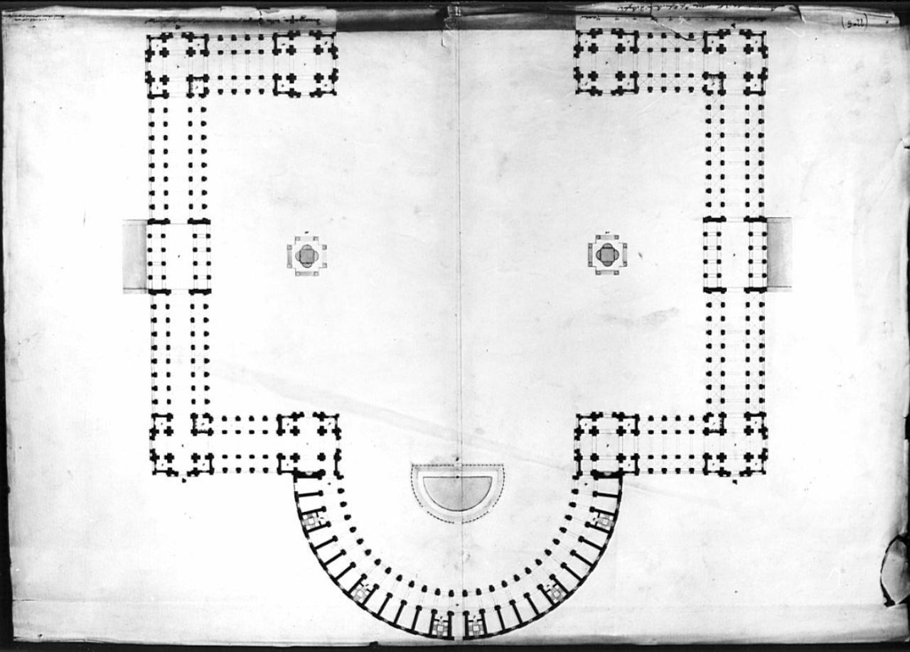 Pianta di un mercato coperto con piazza a china, bistro e acquerello azzurro, su fondo chiaro. Piazza rettangolare con ampia esedra semicircolare superiormente conclusa da porticati perimetrali con due fontane destro e sinistro al centro e grande vasca semicircolare nell'esedra.