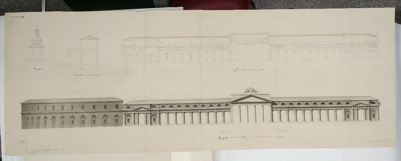 - NOTIZIE STORICO CRITICHE Il disegno fa parte di una serie di tre tavole conservate nella cartella 12 che raccoglie numerosi saggi di concorso rifiutati dalla commissione esaminatrice. Il progetto vinse il concorso del 1837 ed era destinato alla donazione accademica. Le tavole sono autografate e datate, e fornite è di un motto che le contraddistingue. Nella stessa cartella sono conservate anche prove di accesso alla pensione romana e altri progetti.