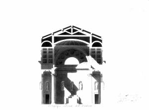 Sezione di un oratorio china, bistro e acquarello rosato, azzurro, su fondo chiaro entro margine a china. Sezione trasversale con vista dell'aula rettangolare con l'altare e 3 nicchie superiori con statue, ai lati colonne lisce con capitello corinzio e vista del portico con sezione dei lacunari. Le colonne reggono una trabeazione che corre lungo tutte le pareti; superiormente lunetta con corona semicircolare a tondi con fiore centrale, pennacchi affrescati e vista delle volte a botte cassettonate lateralmente. Cupola ribassata e sezione del tetto con vista dell'orditura. Marginato.