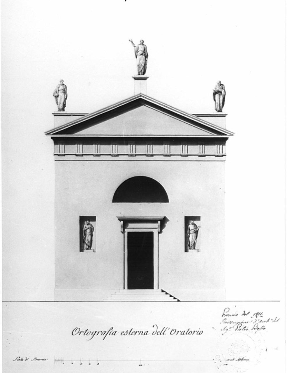 Marginato. Prospetto di Oratorio a china e bistro su fondo chiaro entro linea di margine a china. Facciata con porta centrale sormontata da cornice sorretta da mensola ai lati della quale sono poste nicchie rettangolari con statue. Superiormente in asse con l'ingresso lunette prive di cornici. La parete liscia è coronata da cornice e fregio dorico. Timpano triangolare coronato da statua su piedistallo centrale. Ai lati due balaustre piene sostengono due figure di santi.