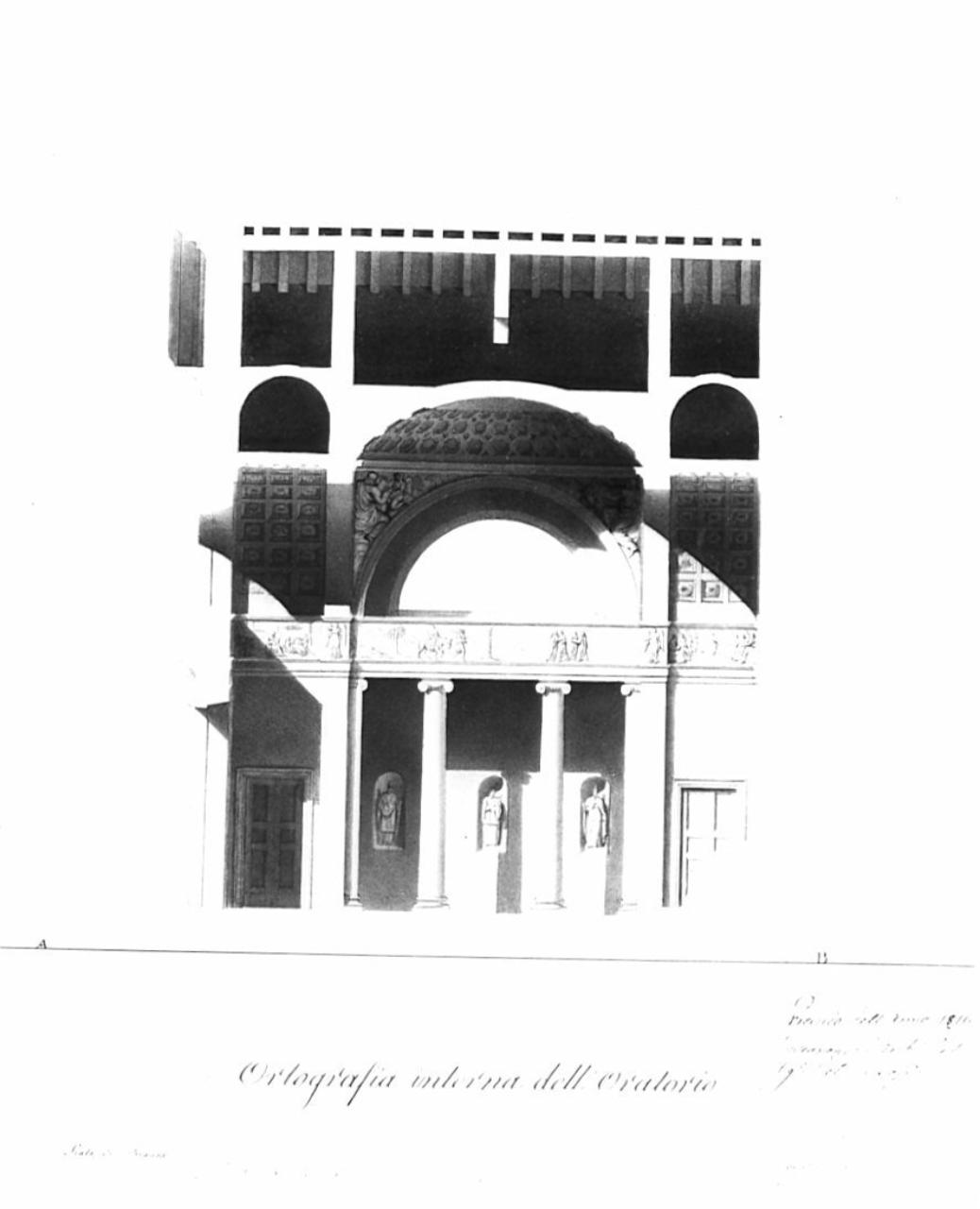 Marginato.Sezione di un Oratorio a china e bistro, acquarello rosato e azzurro su fondo chiaro entro linea di margine a china. Vista dell' aula centrale con due colonne libere dal fusto liscio e capitello ionico e della parete con 3 nicchie contenenti statue di santi. Ai lati porte d'ingresso ai vani angolari. Superiormente architrave a fasce e fregio, balaustra scolpito con scene sacre. Grande copertura a lunette fiancheggiata da affreschi sui pennacchi che sostengono una cupola ribassata a cassettoni. Lateralmente delle nicchie vista della volta a botte cassettonata. superiormente sezione sul tetto con vista dell'orditura.