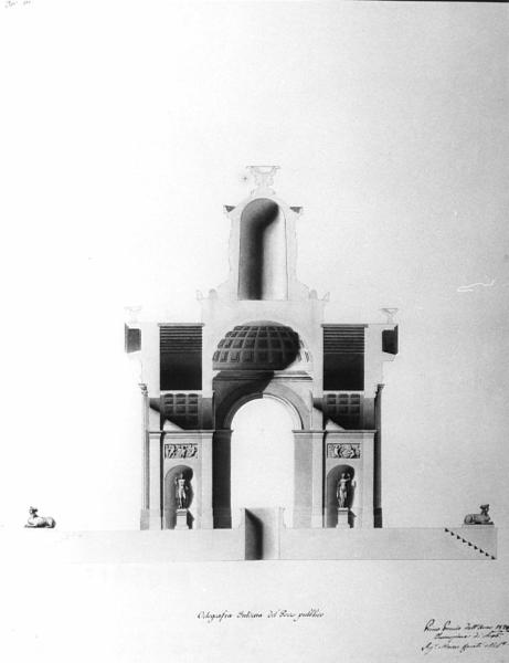sezione del pozzo pubblico a china, bistro e acquarello rosa. Vista della sezione delle gradinate del pozzo. Vista degli intradossi laterali con nicchie e statue. Superiormente: copertura a cupola cassettonata al centro, vista della muratura campita di rosa e della torretta centrale interna all'urna.