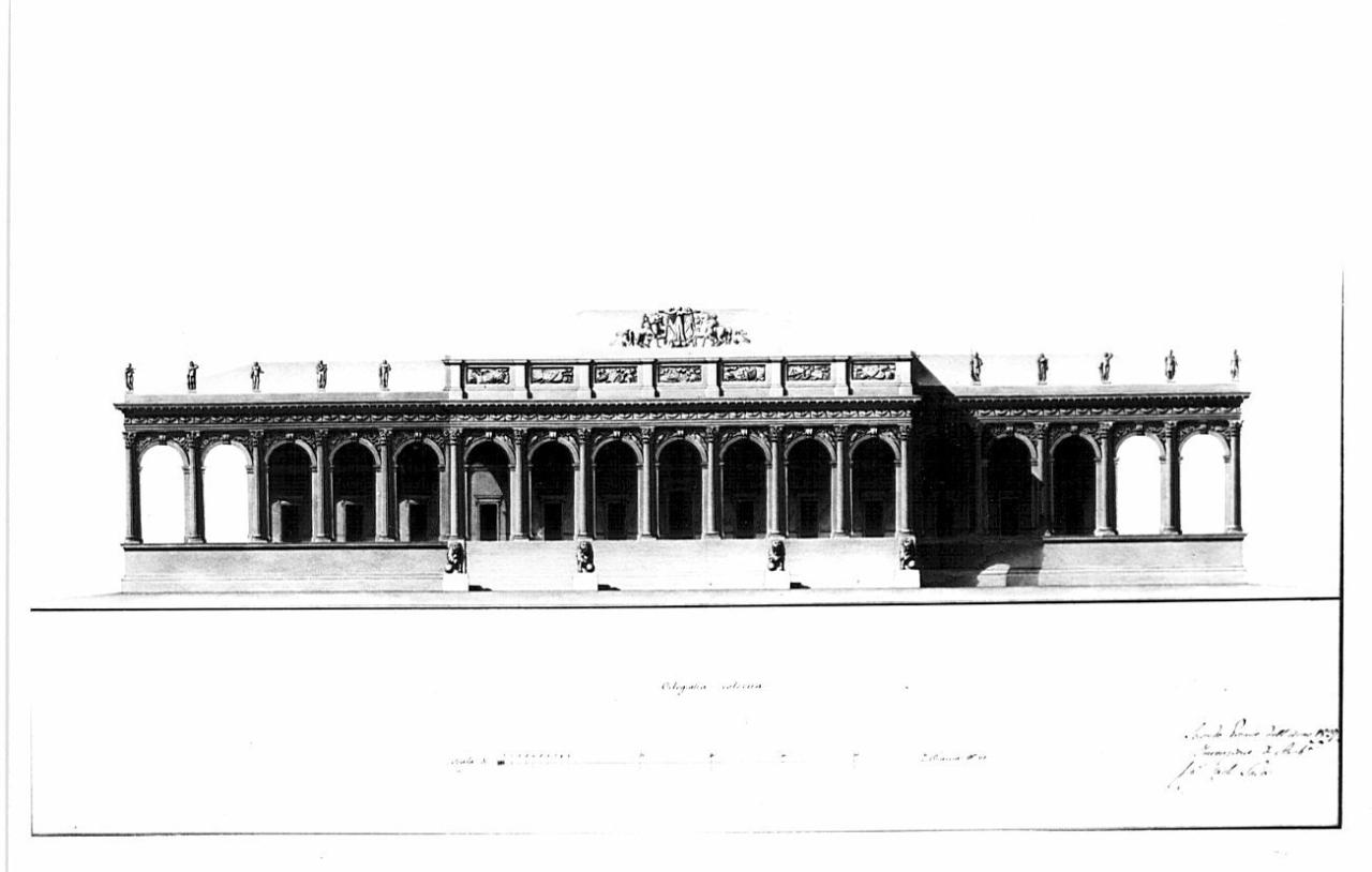 Prospetto di edificio a china, bistro e acquarello azzurro, su sfondo chiaro, entro linea di margine a china. Prospetto di poticato su stilobate e gradinata centrale con 4 leoni su piedistalli. Il porticato è formato da archi a tutto sesto e colonne corinzie addossate a pilastri sui fianchi dell'arco. Un fregio a festoni corre I lungo tutto l' edificio che si conclude con una cornice adorna di statue. Alla sommità gruppo statuario. Marginato.