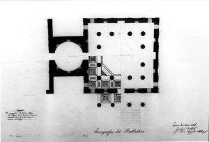 Marginato. Pianta di un Battistero con vista parziale della protezione dei lacunari a china, bistro e acquarello. Pianta simmetrica composta da una Sala quadrata (dove è posta la vasca ottagonale) con pronao d'accesso. Sulla sinistra un vestibolo circolare posto lateralmente all'ingresso principale e da scalini (ambiente di collegamento al tempio con nicchie nel quarto in basso a sin). Vista dei lacunari a quadrati fioriti.