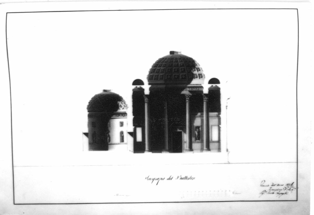 Marginato. Sezione di un edificio a china, bistro e acquarello rosato e azzurro. Veduta del vano centrale circolare e di 4 colonne corinzie, delimitanti un ambulacro. Sul muro di fondo apertura con cimosa, ai lati 2 nicchie rett. con statue di santi, superiorm. doppio fregio continuo scolpito con scene religiose classicheggianti. Vista della volta a padiglione cassettonata. Vista di un ambiente con pareti liscie con nicchie con statue, fregio e cupola cassettonate.